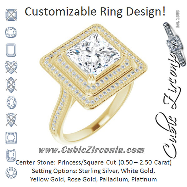 Cubic Zirconia Engagement Ring- The Aubriella (Customizable Princess/Square Cut Design with Elegant Double Halo, Houndstooth Milgrain and Band-Channel Accents)