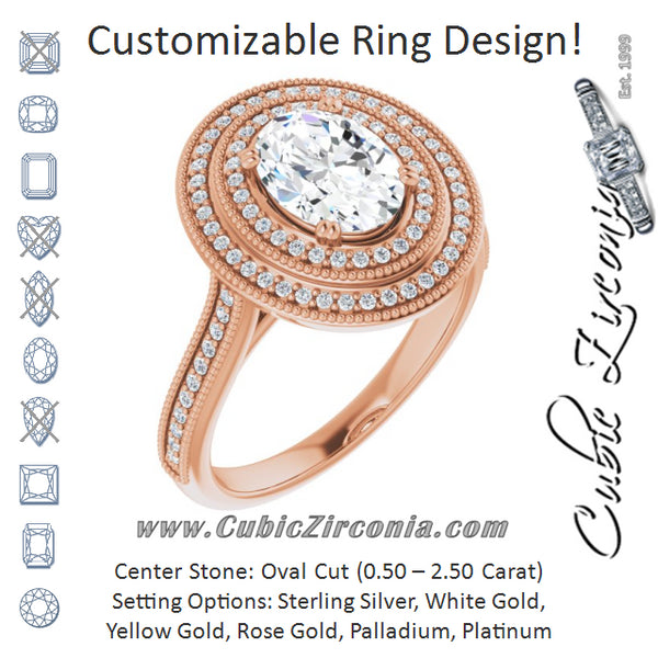 Cubic Zirconia Engagement Ring- The Aubriella (Customizable Oval Cut Design with Elegant Double Halo, Houndstooth Milgrain and Band-Channel Accents)