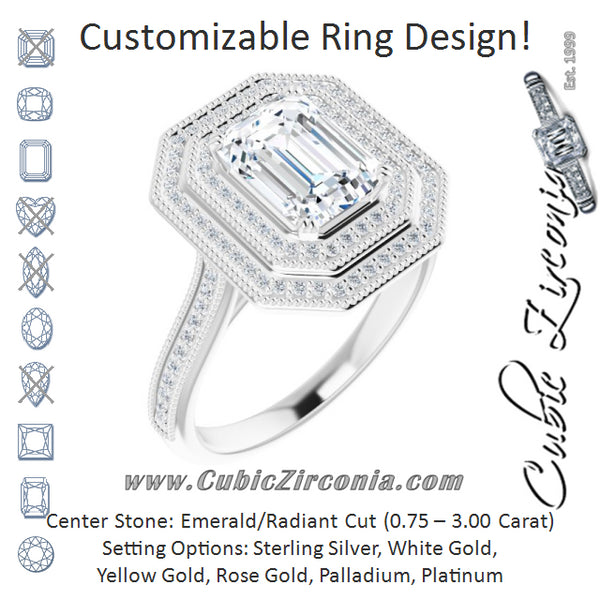 Cubic Zirconia Engagement Ring- The Aubriella (Customizable Emerald Cut Design with Elegant Double Halo, Houndstooth Milgrain and Band-Channel Accents)