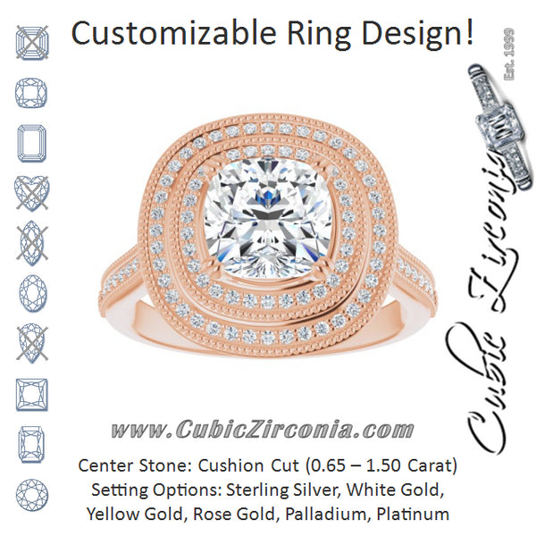 Cubic Zirconia Engagement Ring- The Aubriella (Customizable Cushion Cut Design with Elegant Double Halo, Houndstooth Milgrain and Band-Channel Accents)