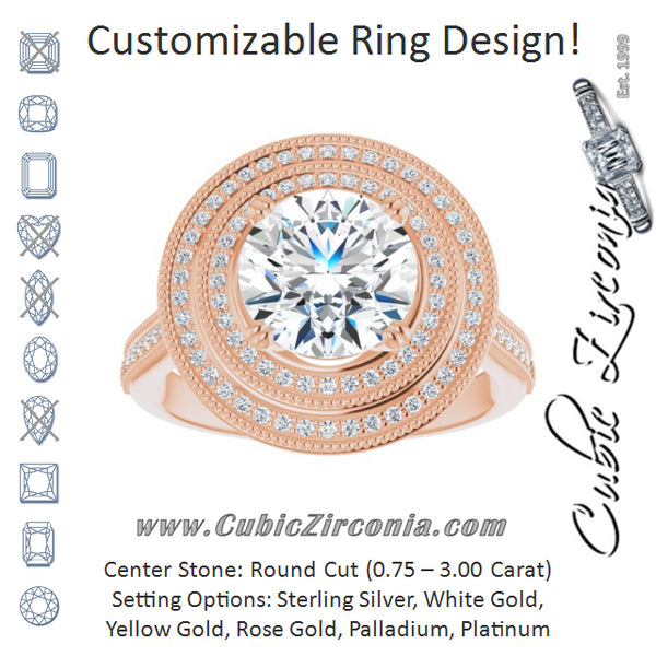Cubic Zirconia Engagement Ring- The Aubriella (Customizable Round Cut Design with Elegant Double Halo, Houndstooth Milgrain and Band-Channel Accents)