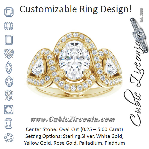 Cubic Zirconia Engagement Ring- The Ana Miranda (Customizable Oval Cut Center with Twin Trillion Accents, Twisting Shared Prong Split Band, and Halo)