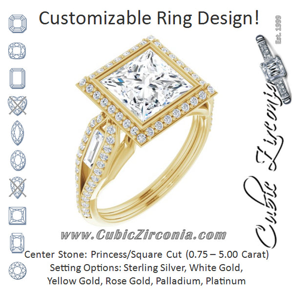 Cubic Zirconia Engagement Ring- The Alekhya (Customizable Cathedral-Bezel Princess/Square Cut Design with Halo, Split-Pavé Band & Channel Baguettes)