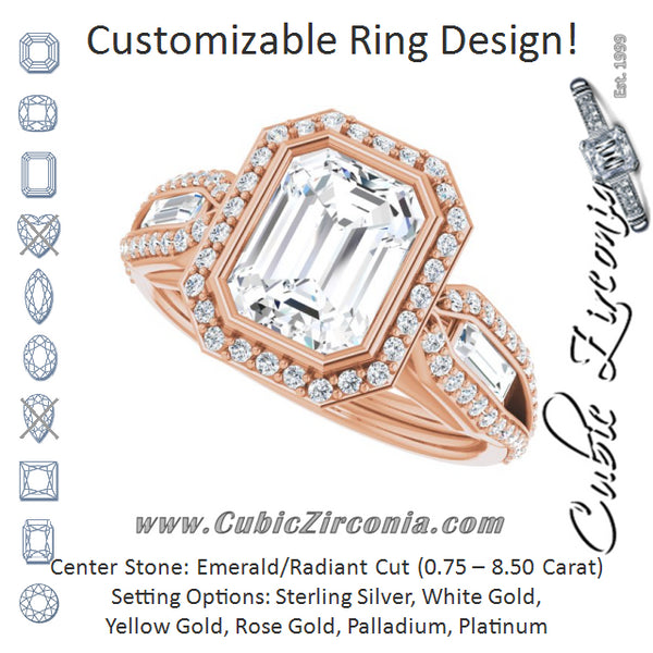 Cubic Zirconia Engagement Ring- The Adoración (Customizable Emerald Cut Style with Halo and Twin Round Bezel Accents)