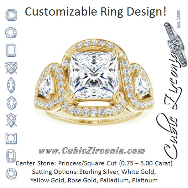 Cubic Zirconia Engagement Ring- The Ana Miranda (Customizable Princess/Square Cut Center with Twin Trillion Accents, Twisting Shared Prong Split Band, and Halo)