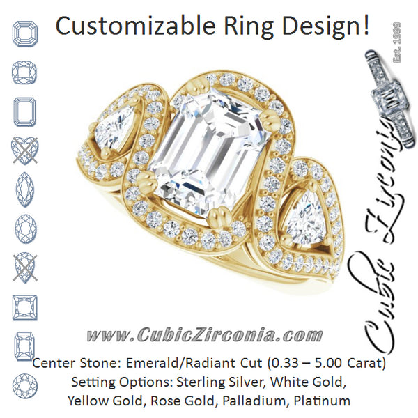 Cubic Zirconia Engagement Ring- The Ana Miranda (Customizable Emerald Cut Center with Twin Trillion Accents, Twisting Shared Prong Split Band, and Halo)