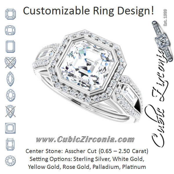 Cubic Zirconia Engagement Ring- The Alekhya (Customizable Cathedral-Bezel Asscher Cut Design with Halo, Split-Pavé Band & Channel Baguettes)