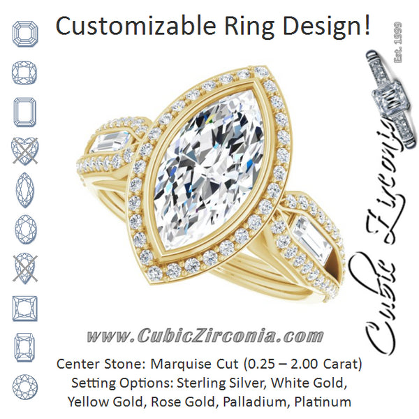 Cubic Zirconia Engagement Ring- The Alekhya (Customizable Cathedral-Bezel Marquise Cut Design with Halo, Split-Pavé Band & Channel Baguettes)