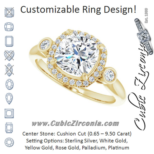 Cubic Zirconia Engagement Ring- The Adoración (Customizable Cushion Cut Style with Halo and Twin Round Bezel Accents)