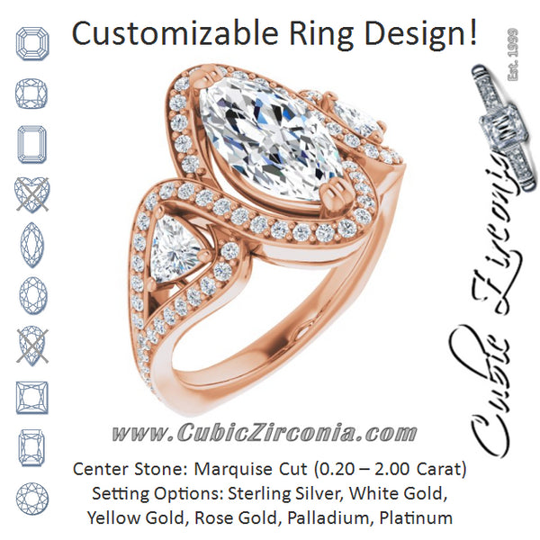Cubic Zirconia Engagement Ring- The Ana Miranda (Customizable Marquise Cut Center with Twin Trillion Accents, Twisting Shared Prong Split Band, and Halo)
