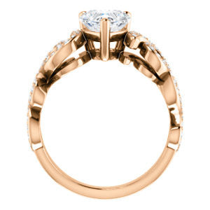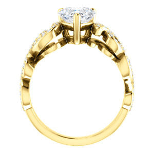 This split-band pave-style engagement ring with flowing lines and organic curves is constructed with one center stone of the shape and carat size you choose, plus sixty eight (count 'em, 68)* individual small side stones that loop, swoop, and swirl left to right and from the bottom up.