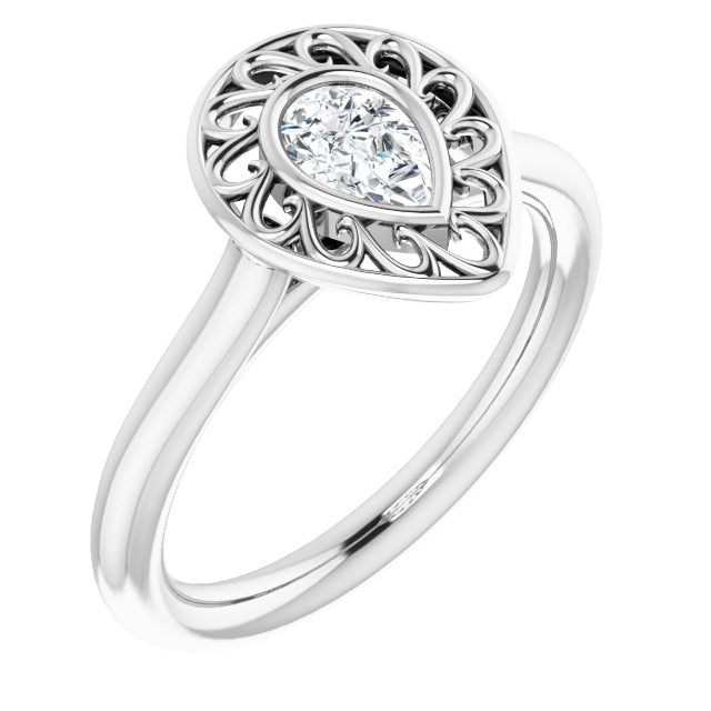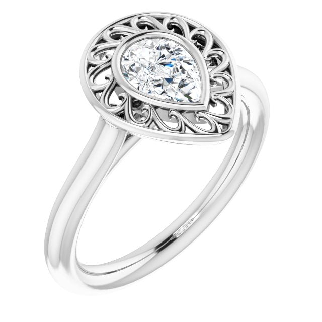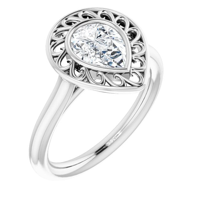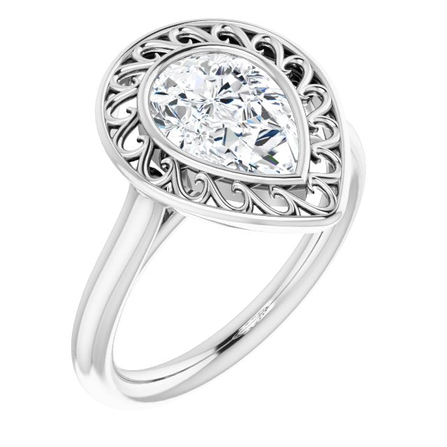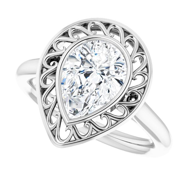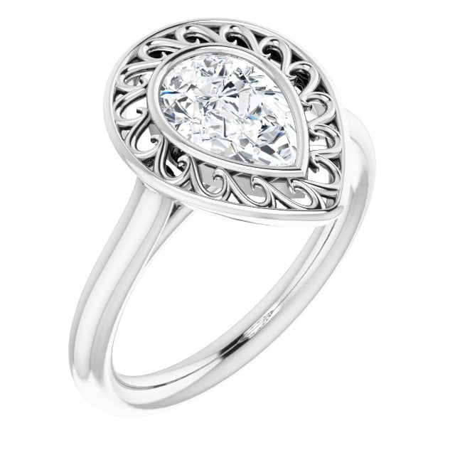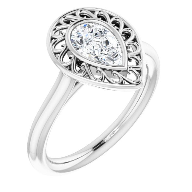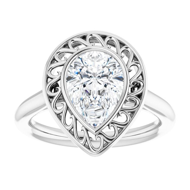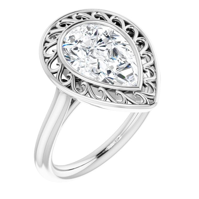 10K White Gold Customizable Cathedral-Bezel Style Pear Cut Solitaire with Flowery Filigree