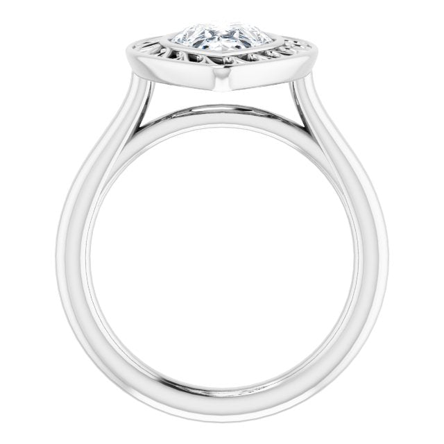 The Addie is a simple, beautiful 5A Pear Cut ring without an ounce of pretension. How can something so modest be so magnificent? Her organic design stands strong and pure, enhanced by flower-inspired metal filigree surrounding the center stone with an awe-inspiring charm like the greatest of natural wonders. Her high cathedral-raised bezel setting is substantial and secure in a world of artificial flash. She's imbued with a powerful sense of positive karma (figuratively) and created to keep everything around her grounded. Remind you of someone? Maybe a daughter for whom a purity ring is planned. Maybe the love of your life - a solid, earthy, and straightforward woman who has simple tastes in fashion. Practical and down-to-earth, possessing of both gentleness and gumption.