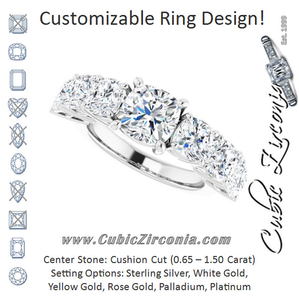 Cubic Zirconia Engagement Ring- The Xiomara (Customizable 7-stone Cushion Cut Design with Large Round-Prong Side Stones)