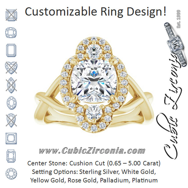Cubic Zirconia Engagement Ring- The Natascha Eva (Customizable Cathedral-raised Cushion Cut Halo-and-Accented Band Design)