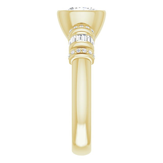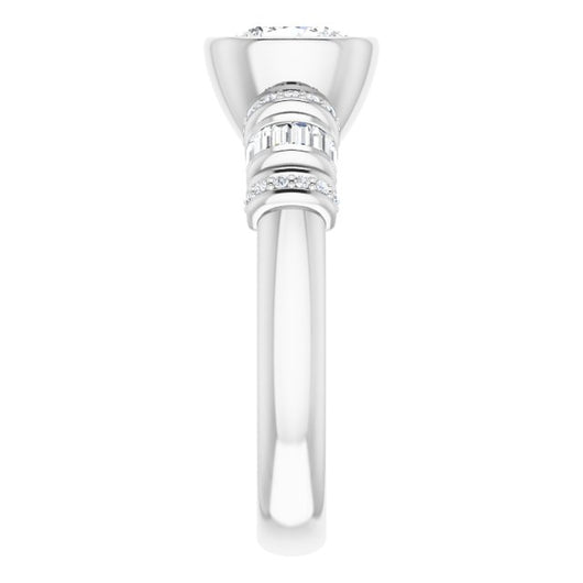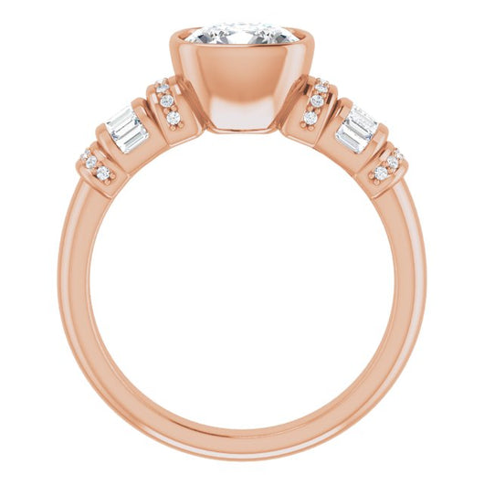 * Your ring’s total carat weight (TCW), band width, weight in grams, and/or number and size of accent, pavé, or halo stones will vary up or down depending on your choice of customizable center stone shape and size, precious metal type, and finger ring size via the drop-down options provided.