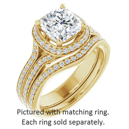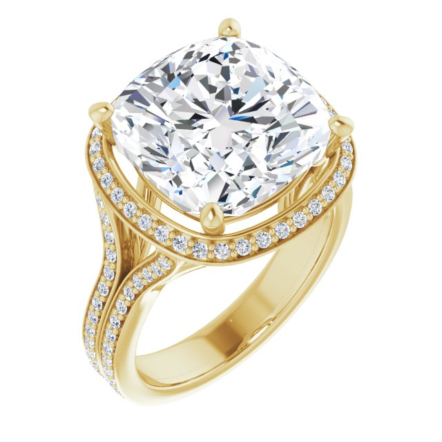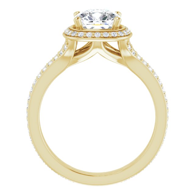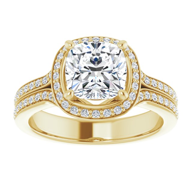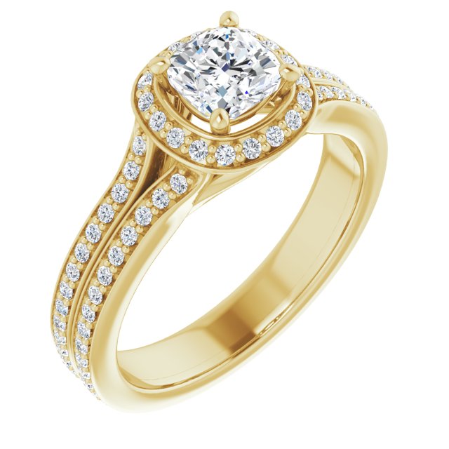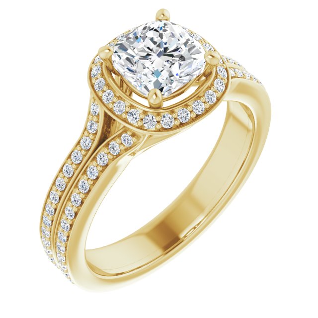 10K Yellow Gold Customizable Cathedral-raised Cushion Cut Setting with Halo and Shared Prong Band