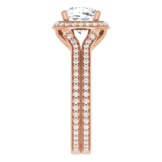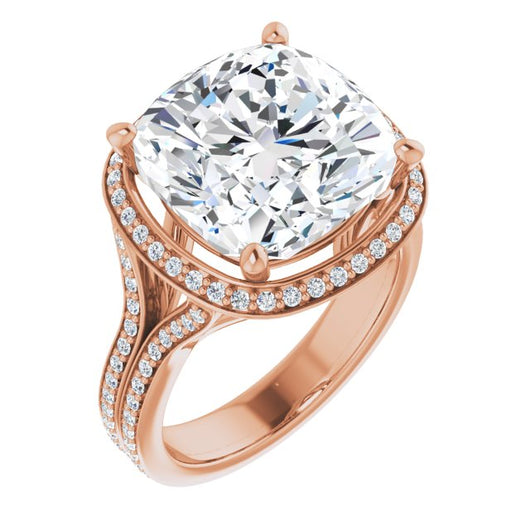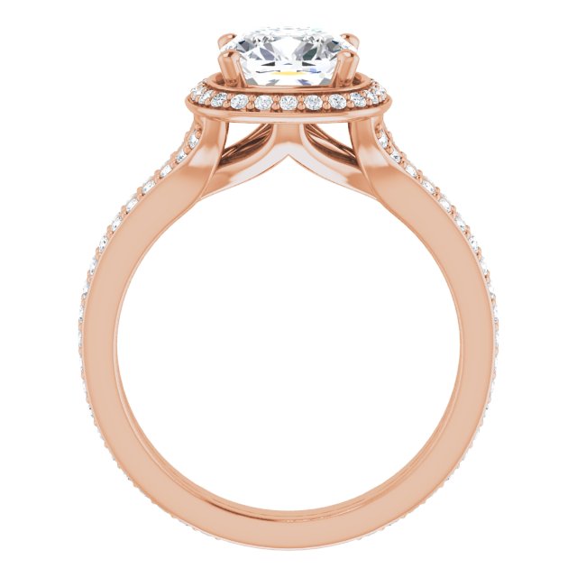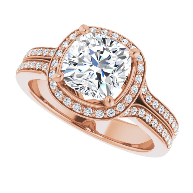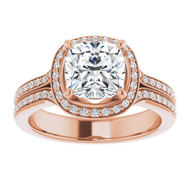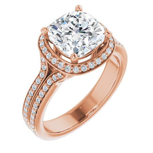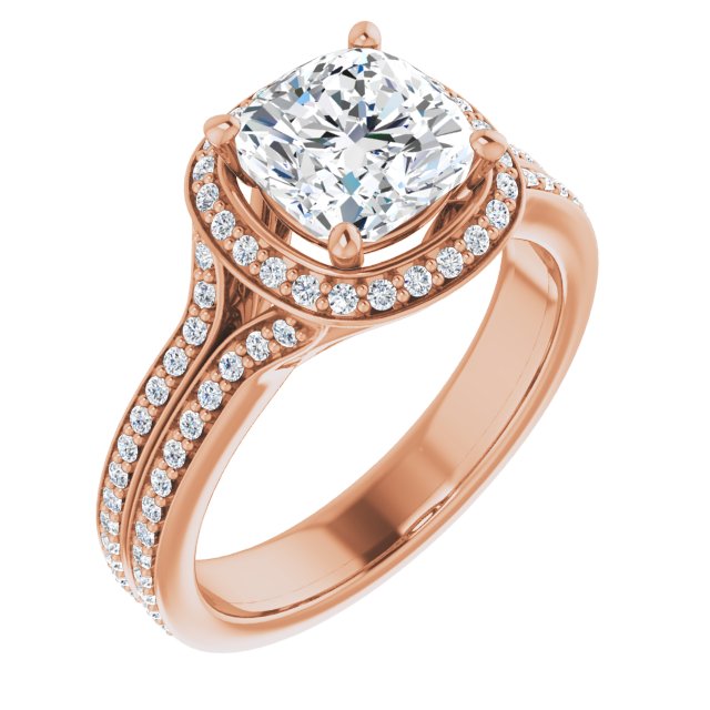 10K Rose Gold Customizable Cathedral-raised Cushion Cut Setting with Halo and Shared Prong Band
