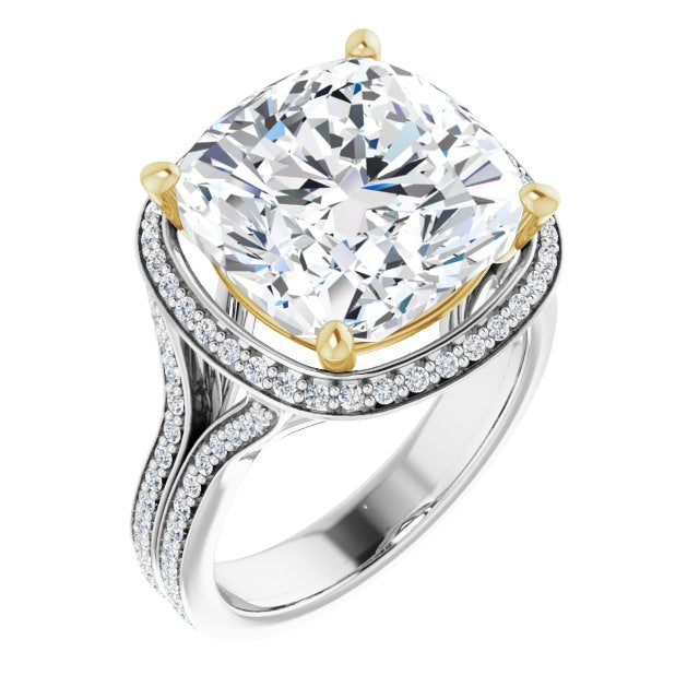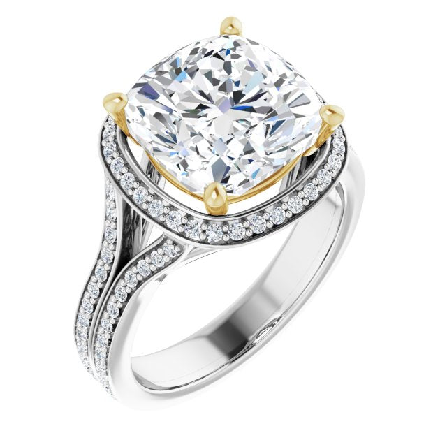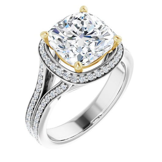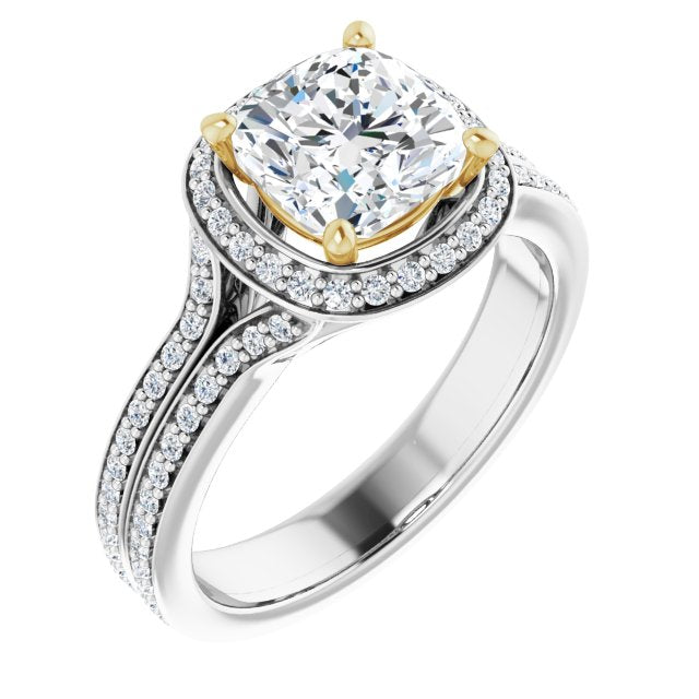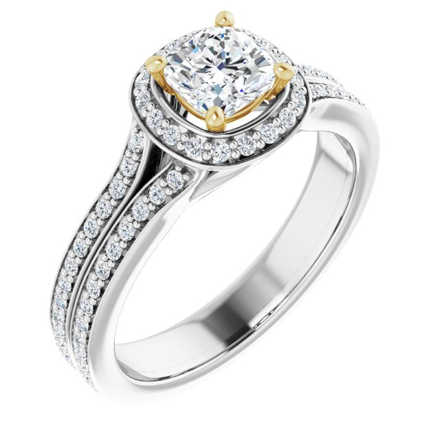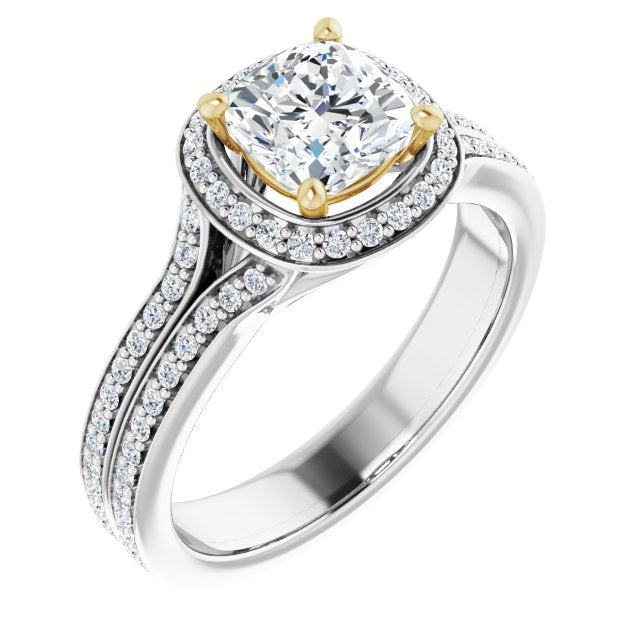 14K White & Yellow Gold Customizable Cathedral-raised Cushion Cut Setting with Halo and Shared Prong Band