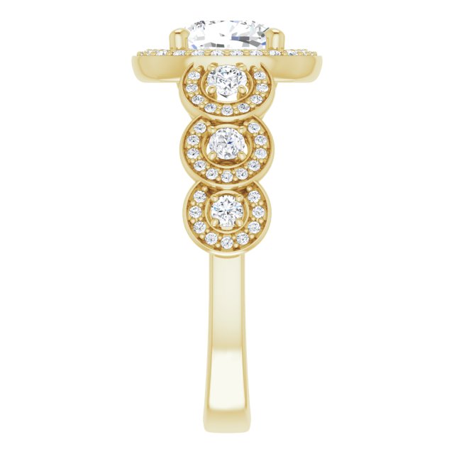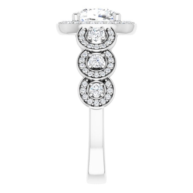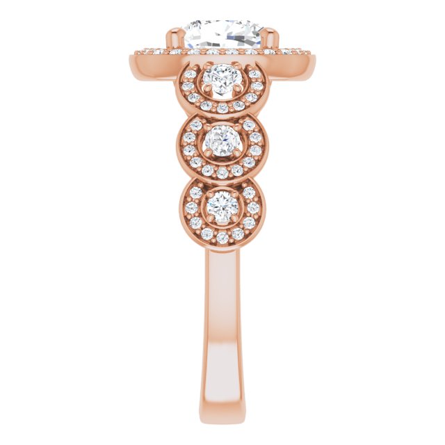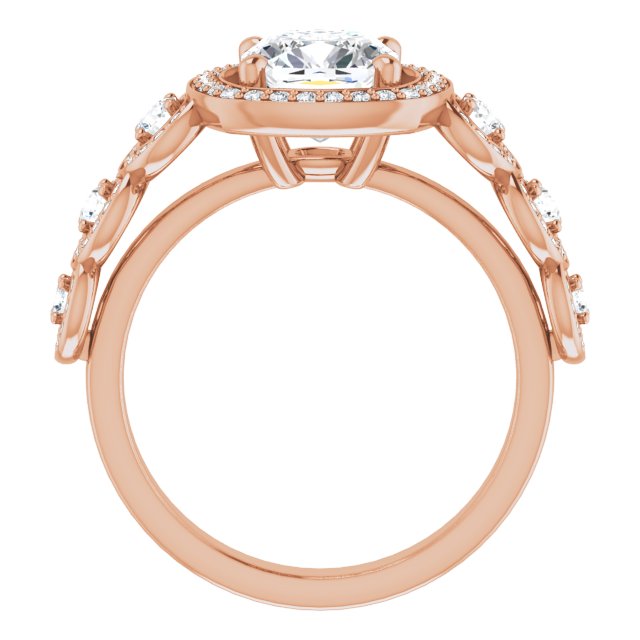 * Your ring’s total carat weight (TCW), band width, weight in grams, and/or number and size of accent, pavé, or halo stones will vary up or down depending on your choice of customizable center stone shape and size, precious metal type, and finger ring size via the drop-down options provided.