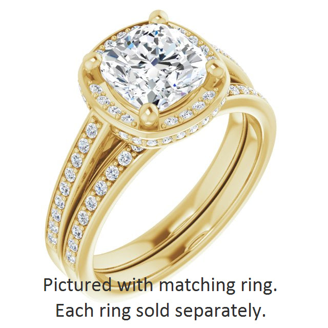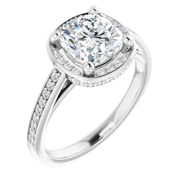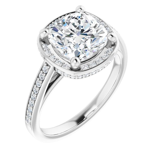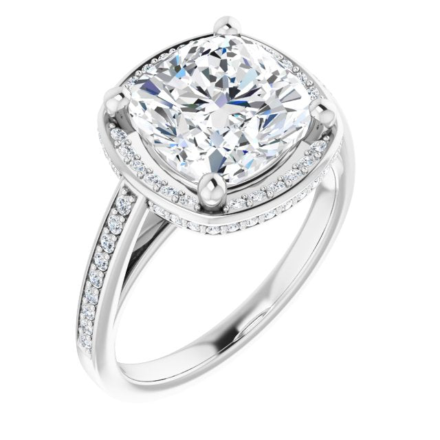 And finger flattery is at an all-time high with this cathedral-raised Cushion Cut ring style featuring some special extras you'll adore. First of all, you can choose your center stone carat weight from the following range of options: 0.65 to 9.50 carats. Second of all, you can choose from any of 12 precious metal types. Whichever combination of center carat size and metal type you choose, we'll manufacture the finished product for you right to order, to your exact finger-ring size and other specifications. The forty-eight (48)* 0.80, 1.00 and 1.10 millimeter round cut accent stones will be precision set into a traditional halo arrangement and a delicate shared prong band before throwing in the eye-opening fashionista whammy of an "under-halo" collar of additional accent stones viewable from the side angle view.