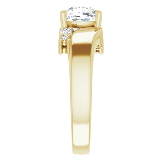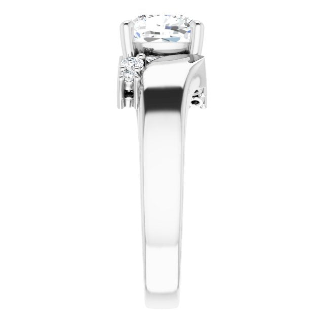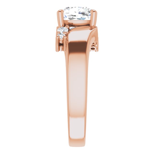 * Your ring’s total carat weight (TCW), band width, weight in grams, and/or number and size of accent, pavé, or halo stones will vary up or down depending on your choice of customizable center stone shape and size, precious metal type, and finger ring size via the drop-down options provided.