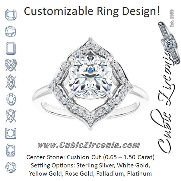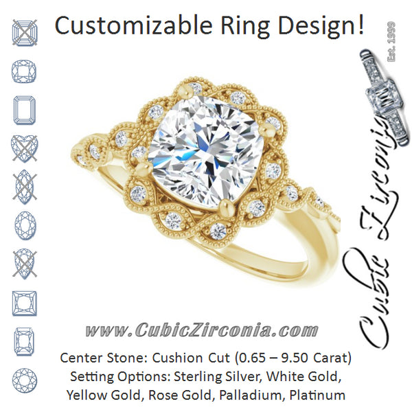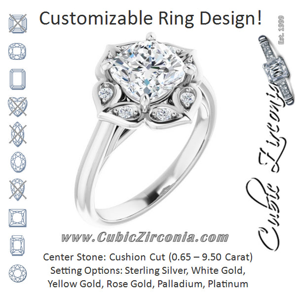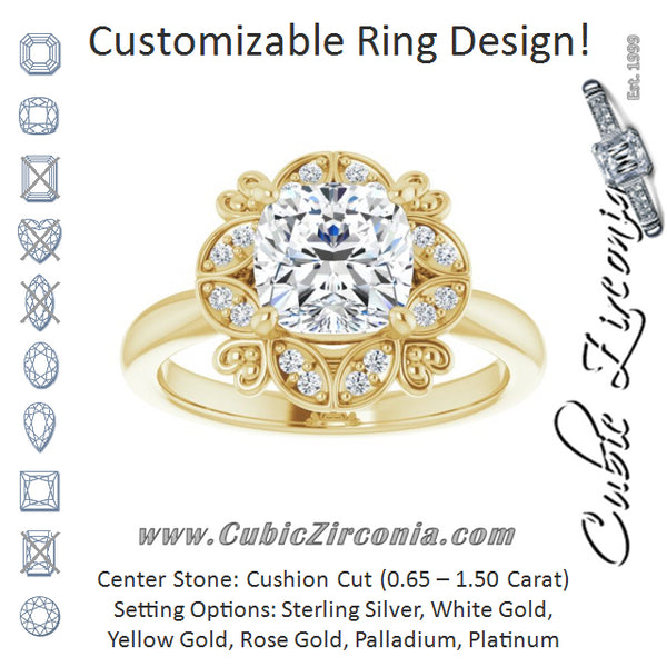 Cubic Zirconia Engagement Ring- The Xiùying (Customizable Cushion Cut Design with Artisan Floral Halo)