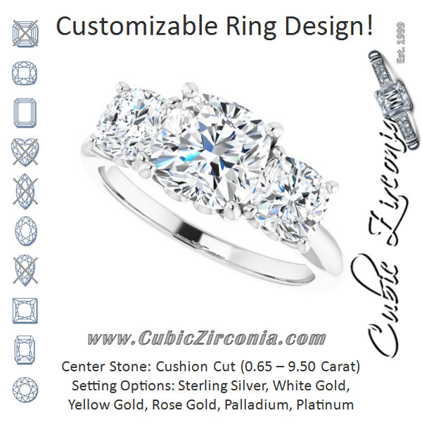 Cubic Zirconia Engagement Ring- The Dayanny (Customizable 3-stone Cushion Cut Design with Thin Band and Twin Round Bezel Side Stones)