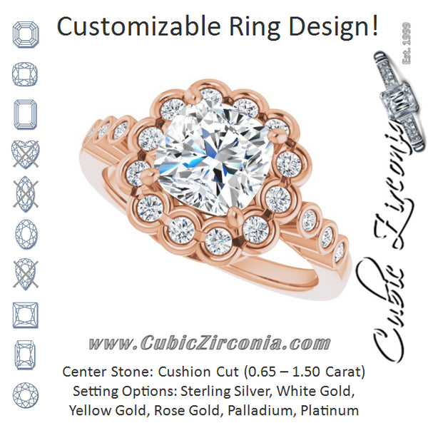 Cubic Zirconia Engagement Ring- The Jeanne (Customizable Bezel-set Cushion Cut with Halo & Oversized Floral Design)
