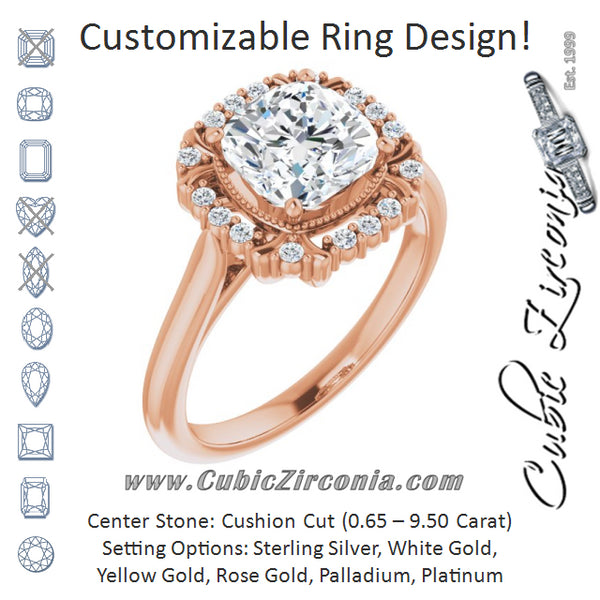 Cubic Zirconia Engagement Ring- The Ashton (Customizable Vintage Cushion Cut Design with Beaded Milgrain and Starburst Semi-Halo)