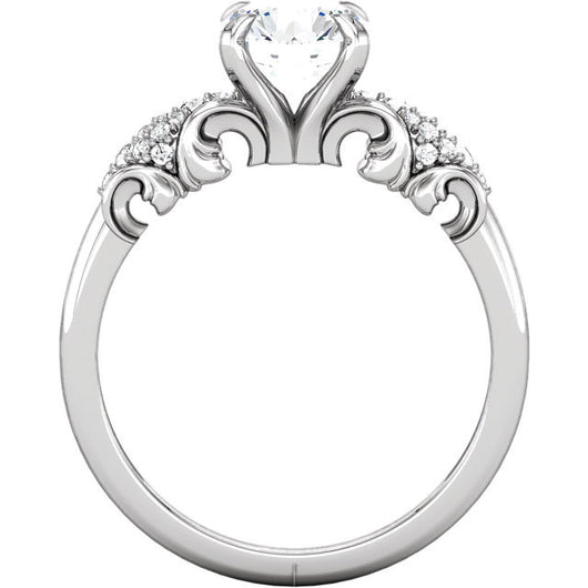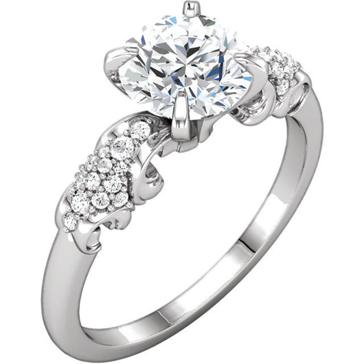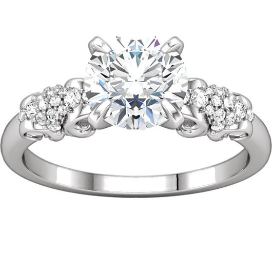 Twenty-eight (28)* glistening round AAAAA diamond-quality Cubic Zirconia side stones swirled in a clustered grape-bunches design on either side of a 1.5 carat round-cut center CZ setting create the pattern of this fantastic engagement ring.