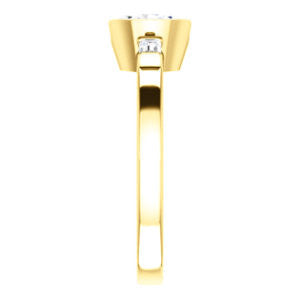 Like your special woman, The Stephanie is a majestic work of art. Show your appreciation for her, and begin the next stage of your life journey together when you give her this pleasing proclamation of class and style. The Stephanie engagement ring can be customized with your choice of any of seven (7) different shaped center stones, and is pictured and priced on this product page in Oval Cut. Choose any center stone size from 0.50 to 3.0 carats. The bezel-set Oval Cut 5A diamond-quality cubic zirconia center stone is flanked by dual 3x2 mm baguette accents, each snugly secured in a bar-setting.  Get The Stephanie engagement ring as a stand-alone or together with the matching anniversary band to complete the cubic zirconia bridal set!