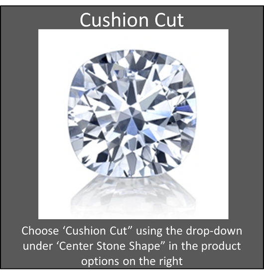 Center Stone Shape: Pick your own center stone shape from the drop-down menu below (Asscher Cut, Cushion Cut, Emerald Cut, Oval Cut, Princess/Square Cut, Radiant Cut, Round Cut)