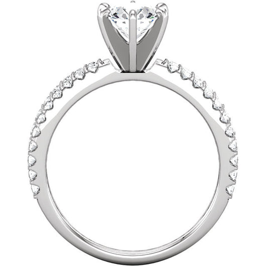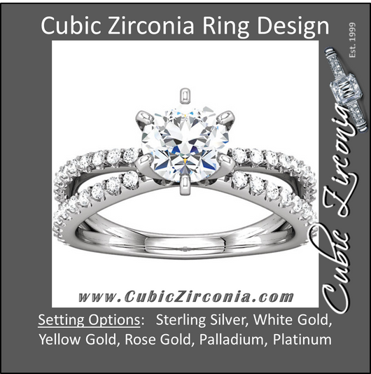 Take a 0.5 Carat, 0.75 Carat, or 1.0 Carat round center-cut AAAAA diamond-quality Cubic Zirconia stone. Add 44* precision-machined small CZ side stones. Take a breathtaking pave band and split the shank in two pieces.