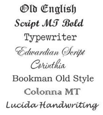 The eight (8) pre-designed fonts we are equipped to laser-engrave onto your jewelry purchase are Bookman OldStyle, Colonna MT, Corinthia, Edwardian Script, Lucida Handwriting, Old English, Script MT Bold, or Typewriter. Any of these choices can be engraved for the same price, and are pictured below.