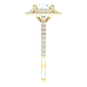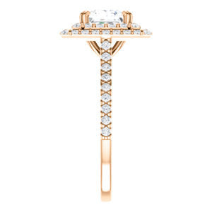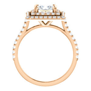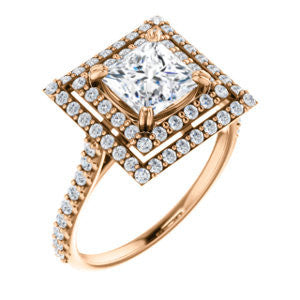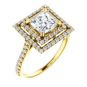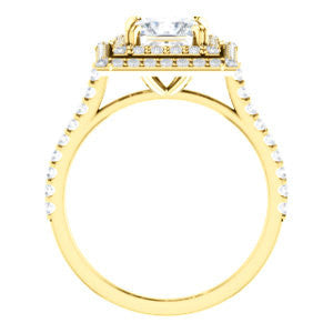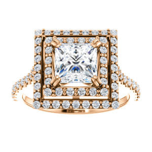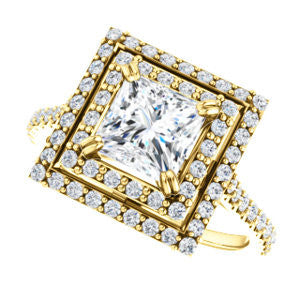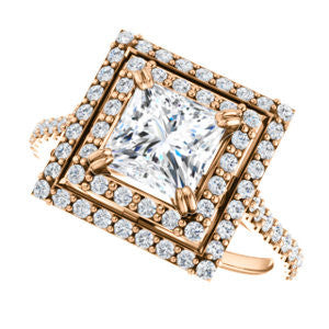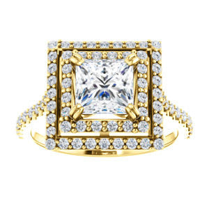 This engagement design is stunning with a Princess Cut center options from 0.40 to 5.0 carats. For the ultimate in customization, and to ensure that her 5A Cubic Zirconia ring will be as unique as she is, you can also change the center stone shape to any of 10 total options. You can also choose the precious metal we use to manufacture this piece from .925 sterling silver, 10K, 14K or 18K yellow, white, or rose gold. Of course, you might love palladium, or 950 platinum and we agree, they're the metals most fit for royalty. It’s up to you. The side stones are round pavé, prong-set in the band and in not one but two halos surrounding the center stone to give a sophisticated look worthy of this lady commanding your love and loyalty. You will appreciate a discount when you complete this look by buying both the engagement ring and matching anniversary band at the same time.