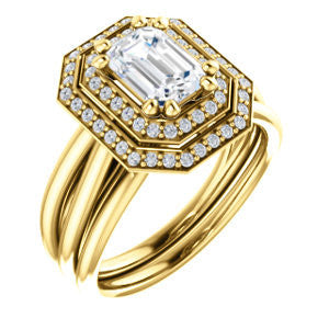 CZ Wedding Set, featuring The Brielle engagement ring (Customizable Emerald Cut Cathedral Double-Halo with Curved Split-Band)