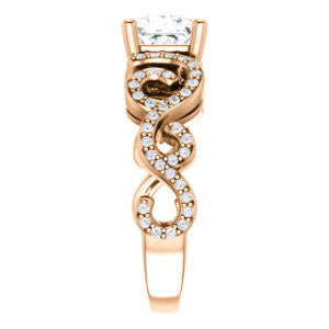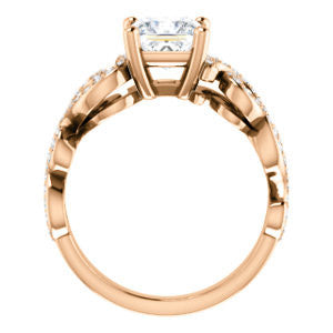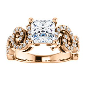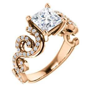 This split-band pave-style engagement ring with flowing lines and organic curves is constructed with one center stone of the shape and carat size you choose, plus sixty eight (count 'em, 68)* individual small side stones that loop, swoop, and swirl left to right and from the bottom up.