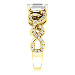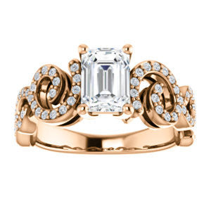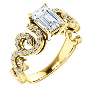 This split-band pave-style engagement ring with flowing lines and organic curves is constructed with one center stone of the shape and carat size you choose, plus sixty eight (count 'em, 68)* individual small side stones that loop, swoop, and swirl left to right and from the bottom up.