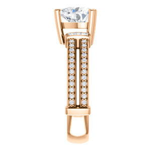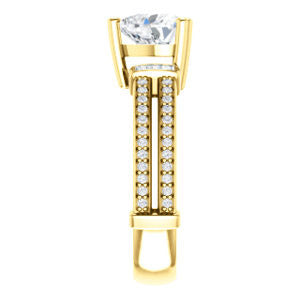 Slip this alluring sparkle-banded beauty onto her finger and watch as you begin to live the world on a string. She will glow with a sultry, slow burn when you gently say those magic words, that ask her to stay, forever, with you. Customize this ring with a 5A diamond-quality center stone in your choice of size to complement the twin sets of 4 on each side center-flanking channel-set straight baguette accents (1.25mm x 1.00mm) and 48* 1.00 mm round channel side stones.