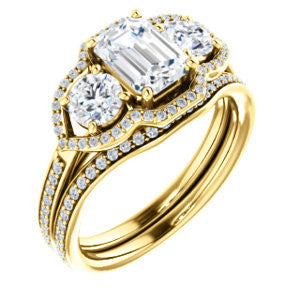 CZ Wedding Set, featuring The Lizabeth engagement ring (Customizable Emerald Cut Enhanced 3-stone Style with Tri-Halos & Thin Pavé Band)