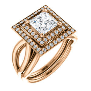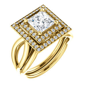 CZ Wedding Set, featuring The Magda Lesli engagement ring (Customizable Double-Halo Style Princess Cut with Curving Split Band)
