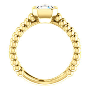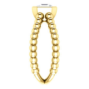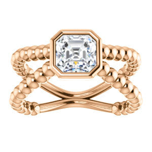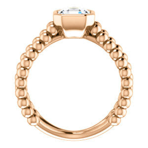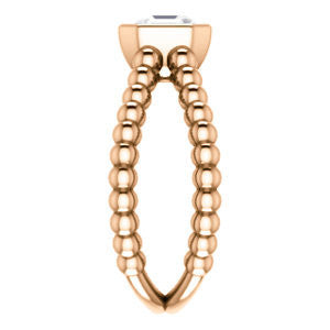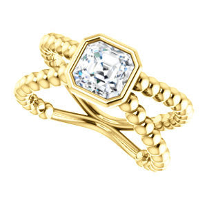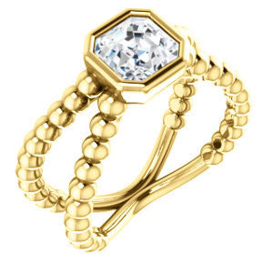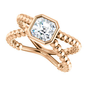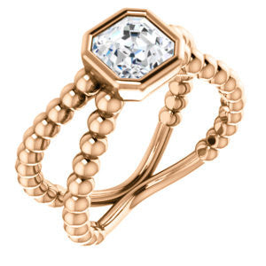 You just received an invitation to Count Oakmont’s housewarming party in Edinburgh. Do you go with formal? Semi-formal? The invite says “black tie optional”. So which option do you choose for HIM, since God knows he can’t be relied upon to make that call?! You’ll have one less concern in a life of making decisions for him the day he made one great decision to marry you, because he gave you The Maria Leeslii, an Asscher Cut solitaire engagement ring that is casual panache at its finest, with maybe just a hint of ostentation in her beaded metal beauty. And now you know exactly what you’ll be wearing, and best of all most of them haven’t even seen you since he proposed. A boldly-placed, bezel-set sparkler of a 5A diamond-quality cubic zirconia center stone is enhanced by a split-band design looking like a double strand of beads twisting ‘round the finger to catch the eye and pull it upwards to focus on center solitaire.