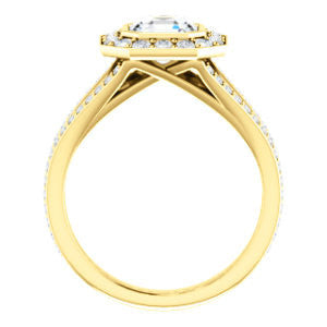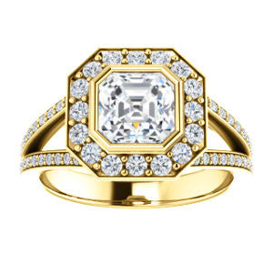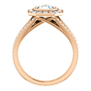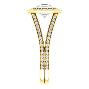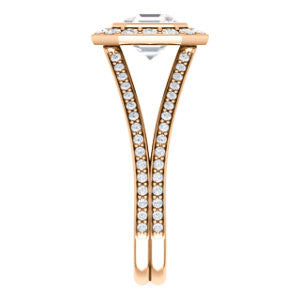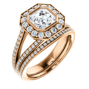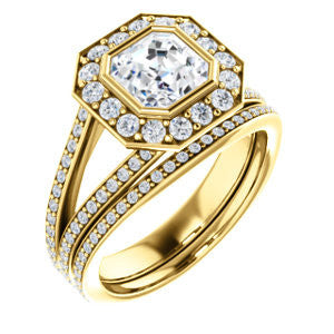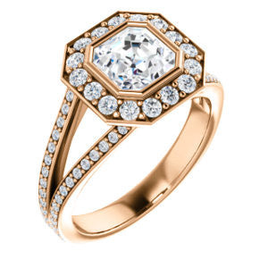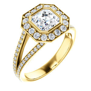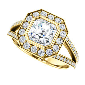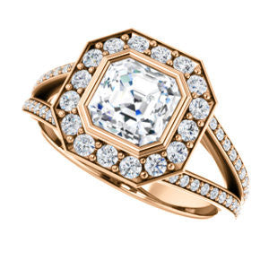 The Maricela engagement ring is a true original made for a true original: the one who caught your attention when you least expected it, she who stood out from all the others. You know her greatness deserves the best, and we think this Hispanic-named ring delivers the goods. A lovely piece of bridal jewelry, The Maricela features a chic bezel-set center stone and seventy-eight (78)* round-cut accent stones from 1.00 to 1.70 mm* in dimension. The fourteen (14)* larger accent stones form a brilliant halo of stones encircling the 0.65 to 5.0 carat Asscher Cut center stone. The remainder of the smaller side stones make up a very pretty pavé band, split in two long, widely separated legs. Together the tapered band sections curve underneath in an attractive decorative prong trellis holding up a cathedral-setting style designed to set sparkle high on the woman's finger who wears it.
