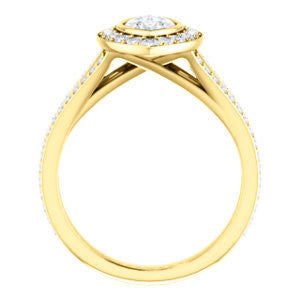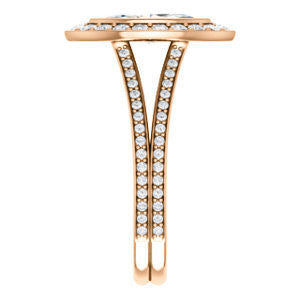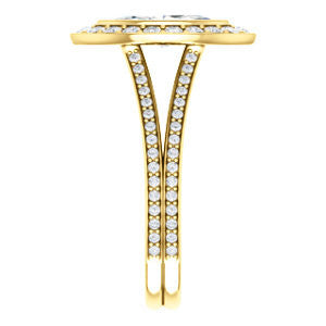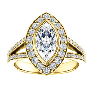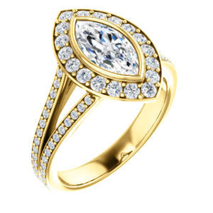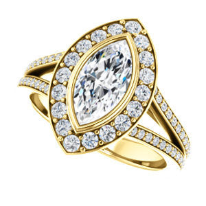 The Maricela engagement ring is a true original made for a true original: the one who caught your attention when you least expected it, she who stood out from all the others. You know her greatness deserves the best, and we think this Hispanic-named ring delivers the goods. A lovely piece of bridal jewelry, The Maricela features a chic bezel-set center stone and seventy-four (74)* round-cut accent stones from 1.00 to 1.70 mm* in dimension. The ten (10)* larger accent stones form a brilliant halo of stones encircling the 0.20 to 2.0 carat Marquise Cut center stone. The remainder of the smaller side stones make up a very pretty pavé band, split in two long, widely separated legs. Together the tapered band sections curve underneath in an attractive decorative prong trellis holding up a cathedral-setting style designed to set sparkle high on the woman's finger who wears it.