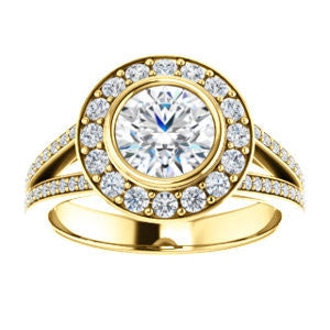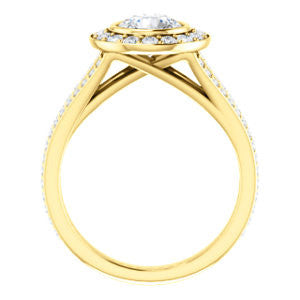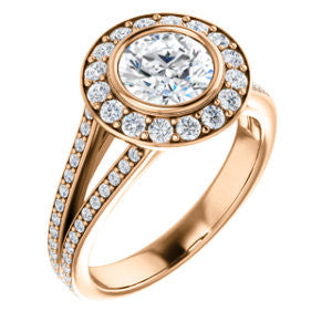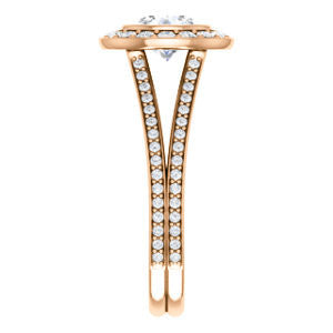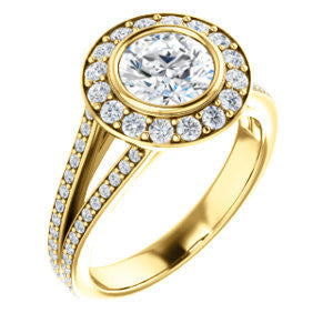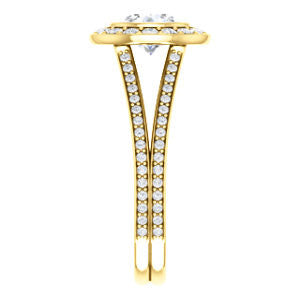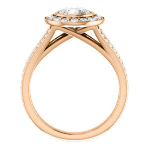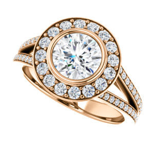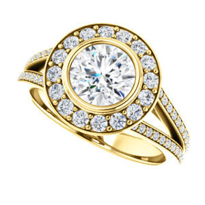 The Maricela engagement ring is a true original made for a true original: the one who caught your attention when you least expected it, she who stood out from all the others. You know her greatness deserves the best, and we think this Hispanic-named ring delivers the goods. A lovely piece of bridal jewelry, The Maricela features a chic bezel-set center stone and seventy-six (76)* round-cut accent stones from 1.00 to 1.70 mm* in dimension. The twelve (12)* larger accent stones form a brilliant halo of stones encircling the 0.25 to 3.50 carat Round Cut center stone. The remainder of the smaller side stones make up a very pretty pavé band, split in two long, widely separated legs. Together the tapered band sections curve underneath in an attractive decorative prong trellis holding up a cathedral-setting style designed to set sparkle high on the woman's finger who wears it.
