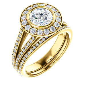 CZ Wedding Set, featuring The Maricela engagement ring (Customizable Bezel-Halo Round Cut Ring with Wide Tapered Pavé Split Band & Decorative Trellis)
