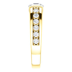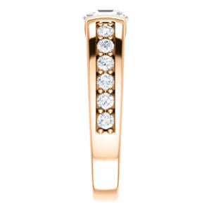 There's a beautiful oversized-stone, channel-inlaid pavé band on this baby. When that baby gets cranked up, it's like a full troop of musicians that suddenly decided to pull the old "play-n-stay" at your once-quiet house. This ring is LOUD, especially in the upper echelons of carat sized center stone choices (from 0.65 to 3.50 carats). You won't find many engagement ring bands as wide as Rosemary She's a hefty baby. And we mean that in totally the most flattering way. With so much blingin' metal weight, this is one of our most expensive engagement rings for sure**! The size of the side CZ gemstones in this hand-crafted special design are one of the ring's most popular features, but we really can't put our finger on why. It's a genuine mystery to us. I mean, we sell rings with more side stones, bigger side stones, and much more complex designs...so why the fascination with Rosemary's baby?