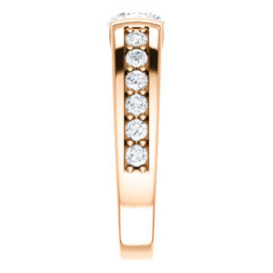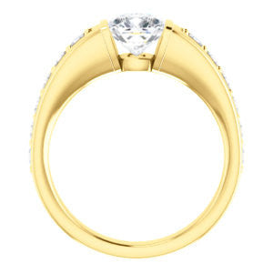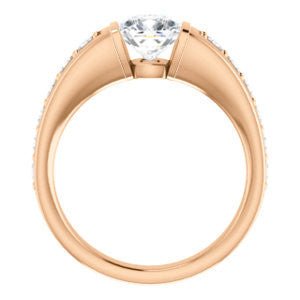 There's a beautiful oversized-stone, channel-inlaid pavé band on this baby. When that baby gets cranked up, it's like a full troop of musicians that suddenly decided to pull the old "play-n-stay" at your once-quiet house. This ring is LOUD, especially in the upper echelons of carat sized center stone choices (from 0.65 to 3.50 carats). You won't find many engagement ring bands as wide as Rosemary She's a hefty baby. And we mean that in totally the most flattering way. With so much blingin' metal weight, this is one of our most expensive engagement rings for sure**! The size of the side CZ gemstones in this hand-crafted special design are one of the ring's most popular features, but we really can't put our finger on why. It's a genuine mystery to us. I mean, we sell rings with more side stones, bigger side stones, and much more complex designs...so why the fascination with Rosemary's baby?