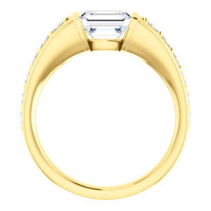 There's a beautiful oversized-stone, channel-inlaid pavé band on this baby. When that baby gets cranked up, it's like a full troop of musicians that suddenly decided to pull the old "play-n-stay" at your once-quiet house. This ring is LOUD, especially in the upper echelons of carat sized center stone choices (from 0.33 to 4.0 carats). You won't find many engagement ring bands as wide as Rosemary She's a hefty baby. And we mean that in totally the most flattering way. With so much blingin' metal weight, this is one of our most expensive engagement rings for sure**! The size of the side CZ gemstones in this hand-crafted special design are one of the ring's most popular features, but we really can't put our finger on why. It's a genuine mystery to us. I mean, we sell rings with more side stones, bigger side stones, and much more complex designs...so why the fascination with Rosemary's baby?